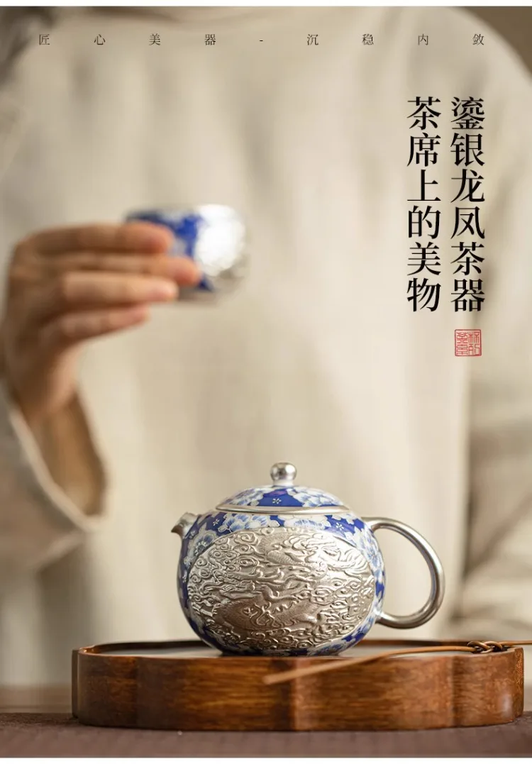 The Royal Dragon and Phoenix Tea Pot Set is a stunning addition to any tea lover's collection. Crafted with gilded silver, this Xishi pot features intricate relief designs of the two auspicious creatures. The set includes one pot and two cups, perfect for traditional Kung Fu tea ceremonies. Bring a touch of elegance and tradition to your household with this beautiful tea pot set.